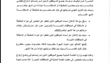 أعلنت وزارة الخدمة المدنية والتأمينات في العاصمة المؤقتة عدن، عن إيقاف صرف مرتبات جميع الموظفين الذين تم رصد حالات ازدواج…
