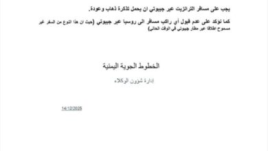 أصدرت الخطوط الجوية اليمنية، الناقل الوطني والمشغّل الرسمي في اليمن، تعميمًا جديدًا خاصًا بالمسافرين ترانزيت عبر مطار جيبوتي، تضمّن مجموعة…