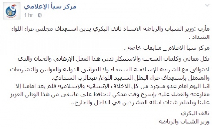 اعلن محافظ محافظة حضرموت رفع حالة التأهب القصوى والإستعداد التام واتخاذ الاجراءات الوقائية الاستباقية لمكافحة مرض الكوليرا في كافة المرافق الصحية والمستشفيات العامة ومنافذ المحافظة ضد هذا الوباء القاتل والفتاك الذي اودى بحياة 20 شخص بالعاصمة عدن .