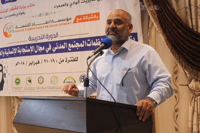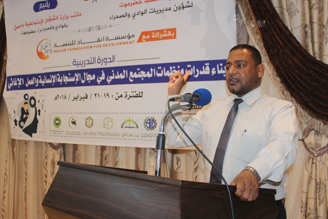 من جانبه اشار مدير عام مكتب الشؤون الاجتماعية والعمل عبدالله باجهام الى ان الدورة تهدف الى تعريف 45 من منظمات المجتمع المدني الحاصلة من المسح الميداني للمنظمات خلال العالم 2017 م على التصنيف ” أ ، ب ” حول المبادئ الإنسانية و آليات التنسيق مع صناديق التمويل المشتركة .