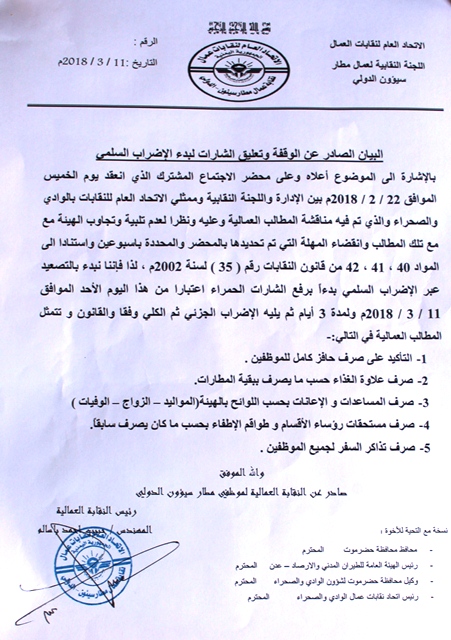 وأُرفق في نهاية البيان نسخة مع التحية لمحافظ محافظة حضرموت ورئيس الهيئة العامة للطيران المدني والارصاد ووكيل محافظة حضرموت لشئون مديريات الوادي والصحراء ورئيس اتحاد نقابات عمال وادي وصحراء حضرموت …