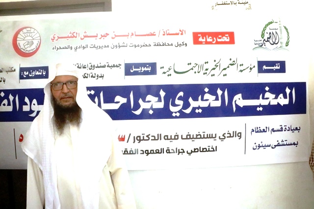 تتواصل لليوم الثالث على التوالي بالعيادة الخارجية لقسم العظام عملية التسجيل للمخيّم الخيري الطبي المجاني لجراحات العمود الفقري الذي سيبدأ يوم الاحد القادم التي تقيمه مؤسسة الضمير الخيرية الاجتماعية بوادي حضرموت بالتعاون مع مكتب وزارة الصحة العامة والسكان بحضرموت الوادي والصحراء وتحتضنه مستشفى سيئون العام على مدى اسبوع ، بتمويل من جمعية صندوق إعانة المرضى بدولة الكويت الشقيقة وبرعاية وكيل محافظة حضرموت لشئون مديريات الوادي والصحراء , ويهدف الى تخفيف معاناة المرضى اللذين يحتاجون للتدخل الجراحي بالعمود الفقري من السفر الى الخارج وما يترتب عليها من تكاليف باهظة ..