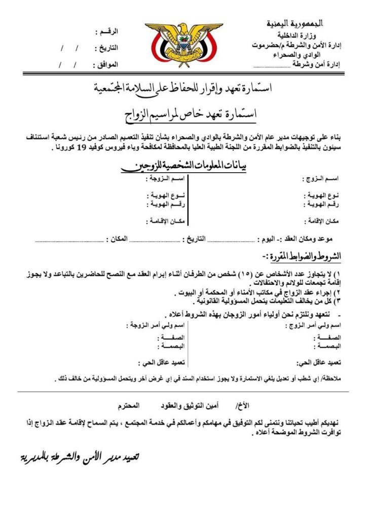 وجه مدير عام الأمن والشرطة بمحافظة حضرموت الوادي والصحراء العميد مبارك احمد العوبثاني اليوم برقية لمديري أمن وشرطة المديريات بتنفيذ إجراءات عقود الزواج خلال فترة وباء فيروس كورونا عبر تعبئة استمارة إقرار وتعهد من قبل طرفي الزواج.