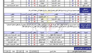 أعلن المركز الوطني للأرصاد والإنذار المبكر عن توقعاته لحالة الطقس في مختلف مناطق البلاد خلال الفترة من عصر اليوم السبت…